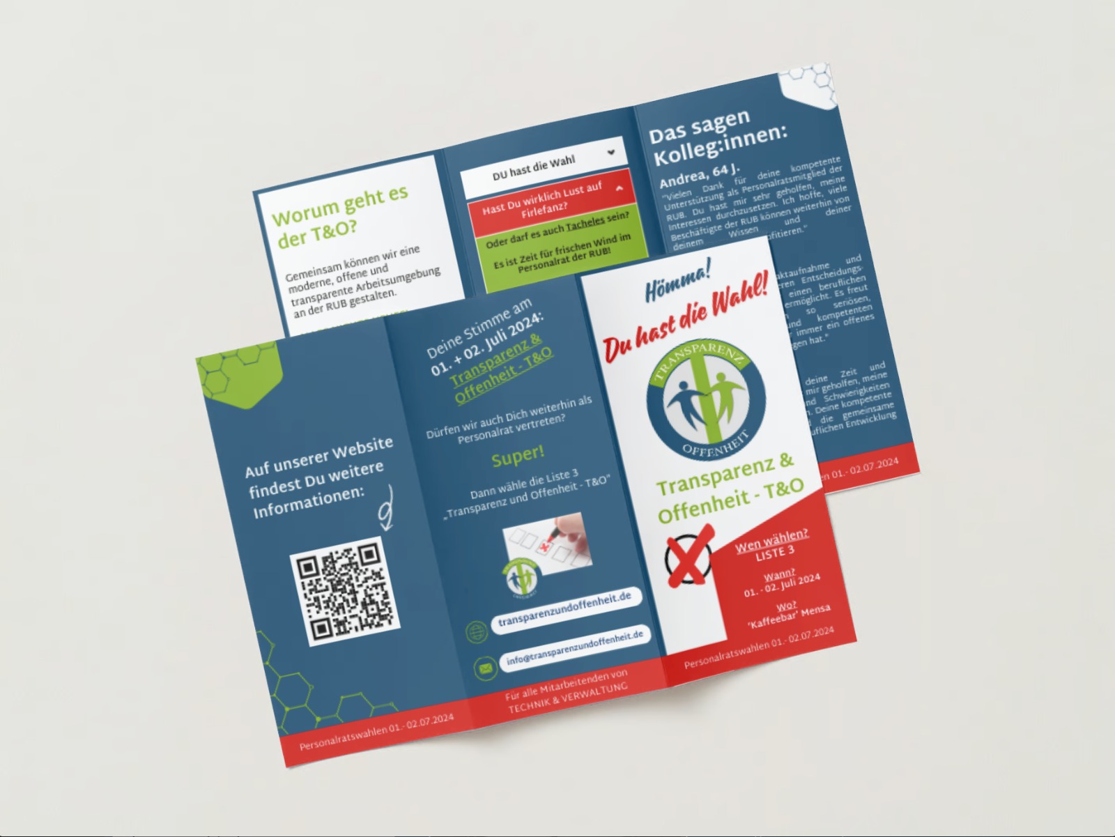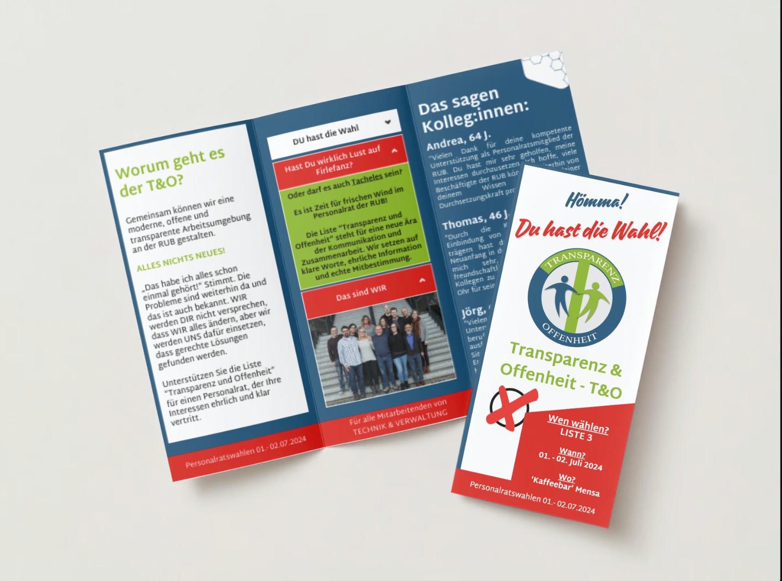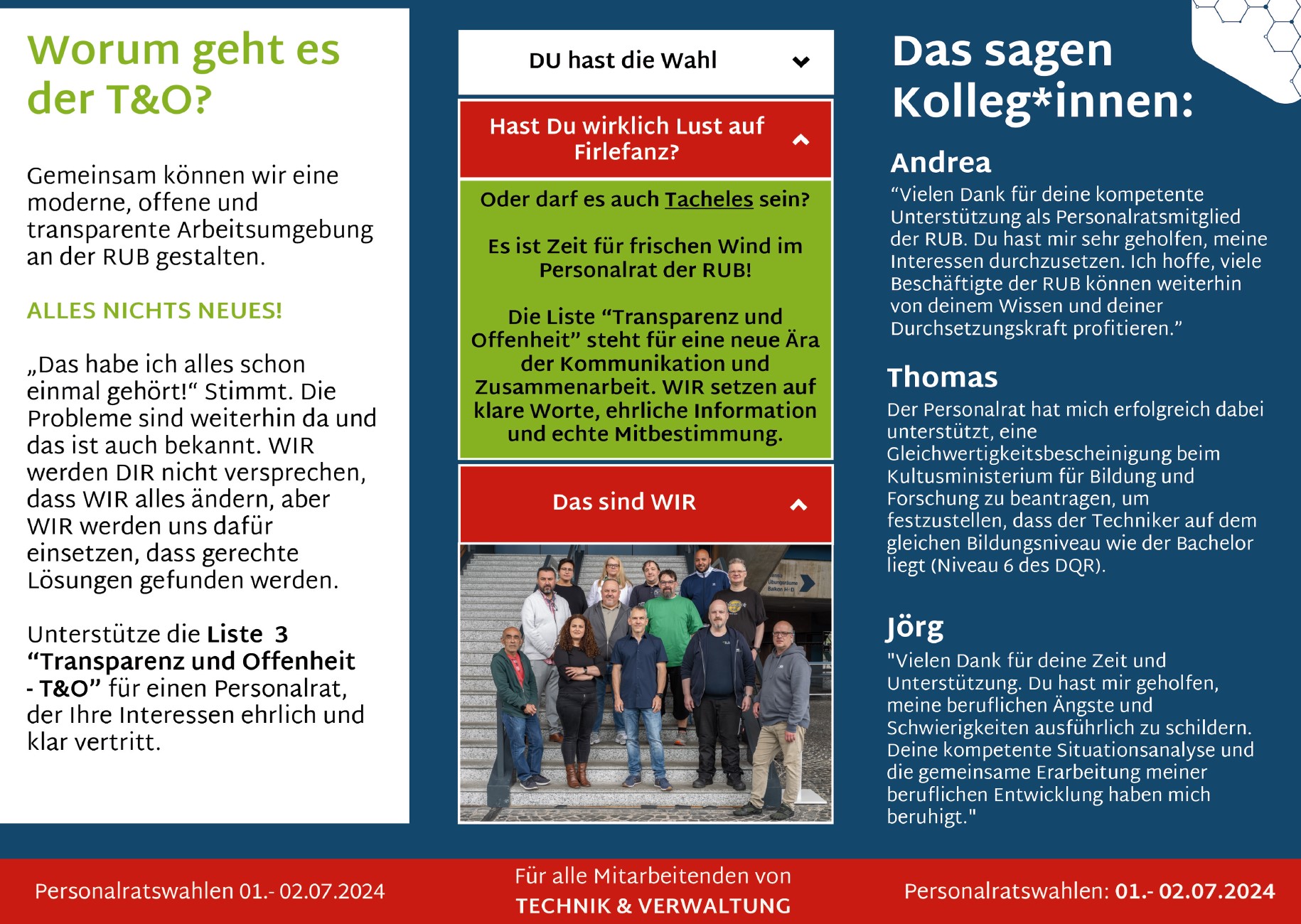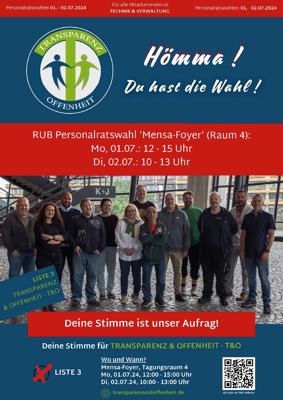 Als Team „Transparenz und Offenheit“ treten wir bei den PR-Wahlen 2024 an. Seit 2016 sind WIR dank eurer Unterstützung im Personalrat aktiv und mit unserer langjährigen Erfahrung setzen WIR UNS engagiert für eine transparente und ehrliche Vertretung aller Mitarbeiter*innen ein. Unsere LISTE 3 „Transparenz und Offenheit – T&O“ findet ihr auf dem Wahlzettel unter Liste 3.