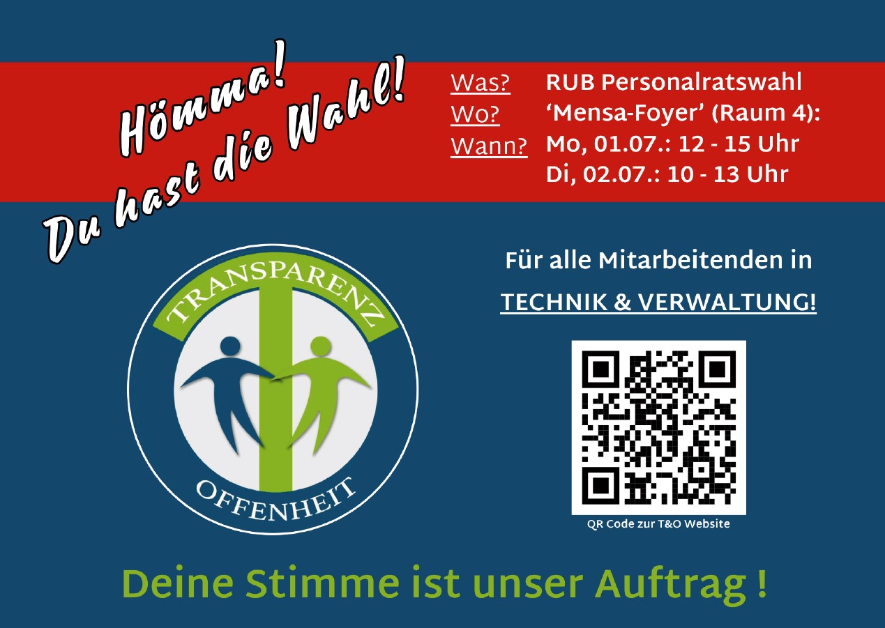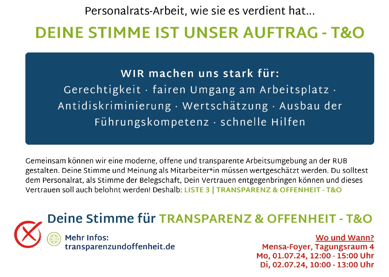 Gemeinsam können WIR an der RUB eine moderne, offene und transparente Arbeitsumgebung schaffen. Unterstütze die Liste „Transparenz und Offenheit“, damit WIR einen Personalrat haben, der deine Interessen ehrlich und klar vertritt.